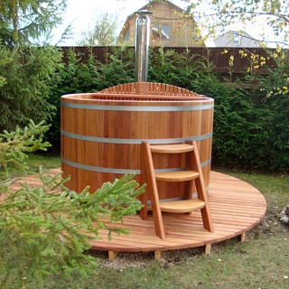 Купель из лиственницы - экономичный материал, хорошо подходит для уличной конструкции.