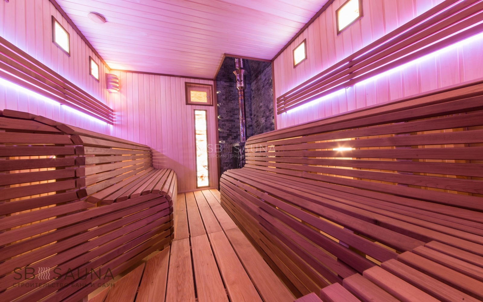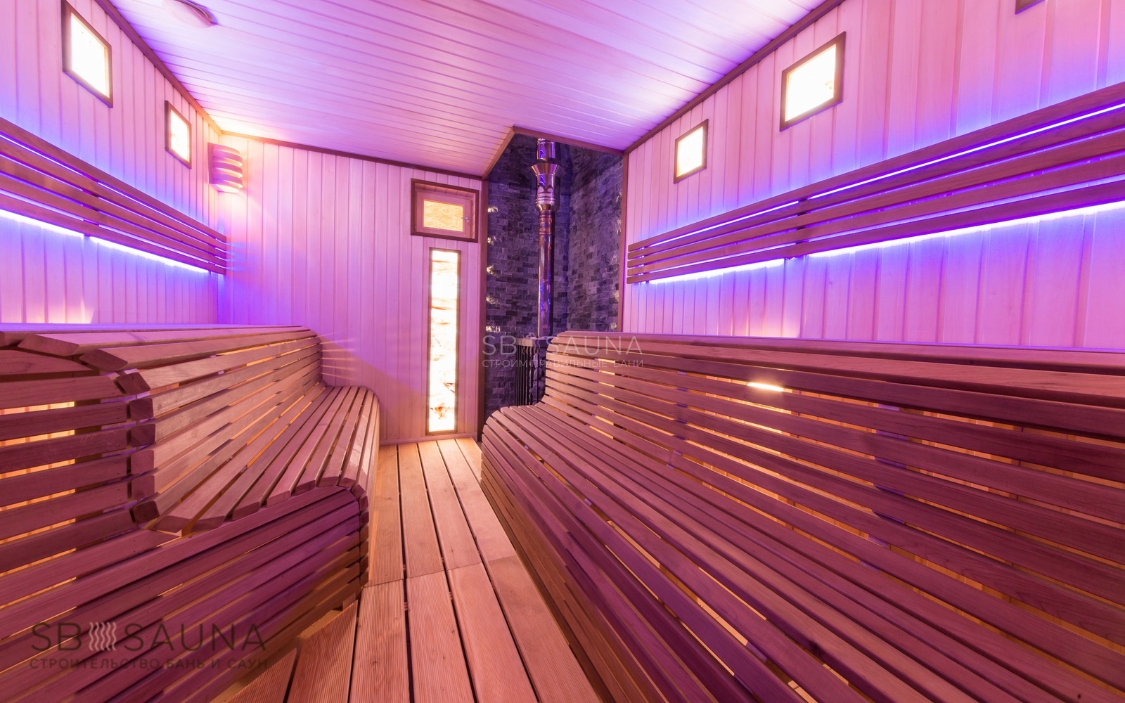 Обратите внимание на уникальность использования палатьев анатомического типа при строительстве данной финской сауны. Завершающим акцентом стало использование светодиодной подсветки и оптоволокна Cariitti.